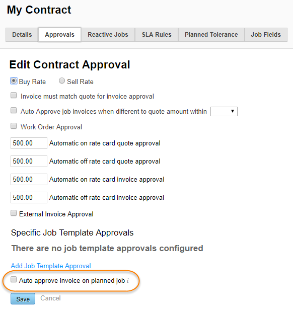 A new option exists on the Contract Approval screen that allows you to automatically approve any planned job invoice, by ignoring any other configured auto approval limits that may be in place. This is useful for Contract work where all planned maintenance costs are agreed upfront with no variations accepted.