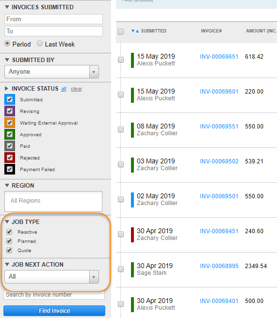 The Invoices list screen provides new ways to filter your job invoices. Further filter your invoices by the Next Action set against jobs or by Job Type: Reactive vs Planned vs Quote.