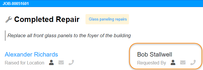 Exposed on the job screen are the requester details captured for the work order. Cycle through the Name, Email or Phone icons to view the content.