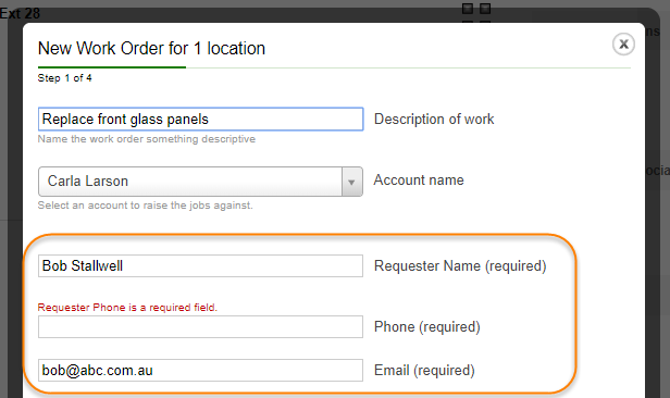 Contact Urbanise if you would like your site to enforce the collection and recording of requester details, (name, email, phone) when raising new work orders. When enabled, it requires the Operator to record the requester details on step 1 of the reactive and quote wizards. Currently all requester fields are optional.