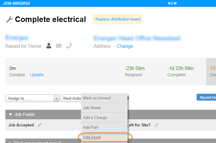 It is possible to attach an asset to an existing reactive job that was raised for a location/site. Depending on the job, operators will see a new menu option “Add Asset” from the job’s COG menu – beside the Next Action field. The list of assets available to select from are assets linked to the job’s location.