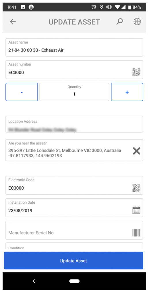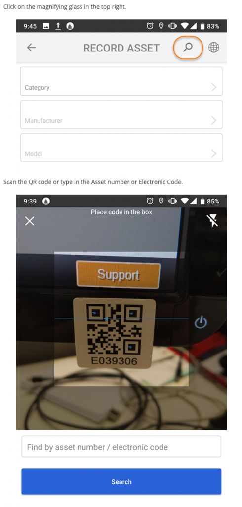 Under the “Record Asset” screen, it is now possible to find an Asset either by scanning its QR/Barcode (if one exists for the asset) or by typing in the Asset Number/Electronic Code.