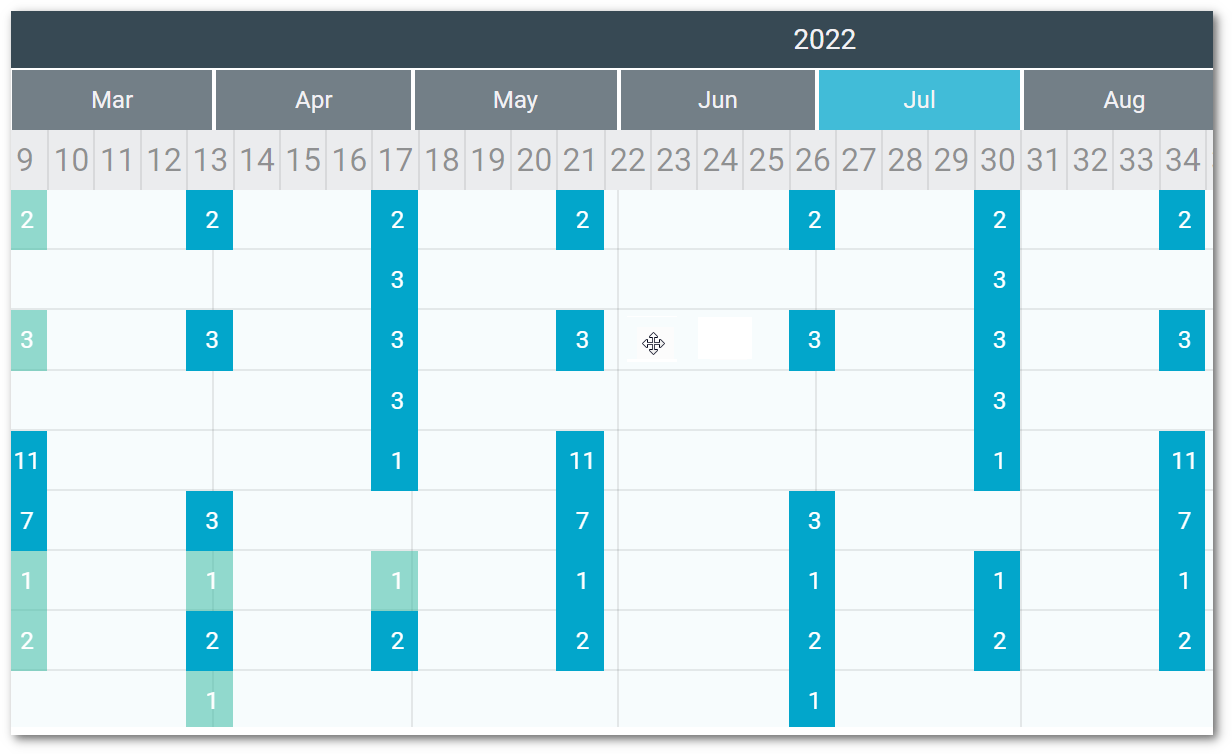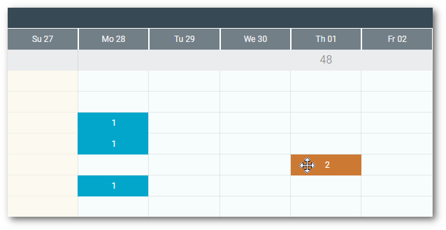 - Left-click to get the ‘drag’ icon, then drag the numbered square to the new date. The colour of the square will turn to orange while it is being moved.