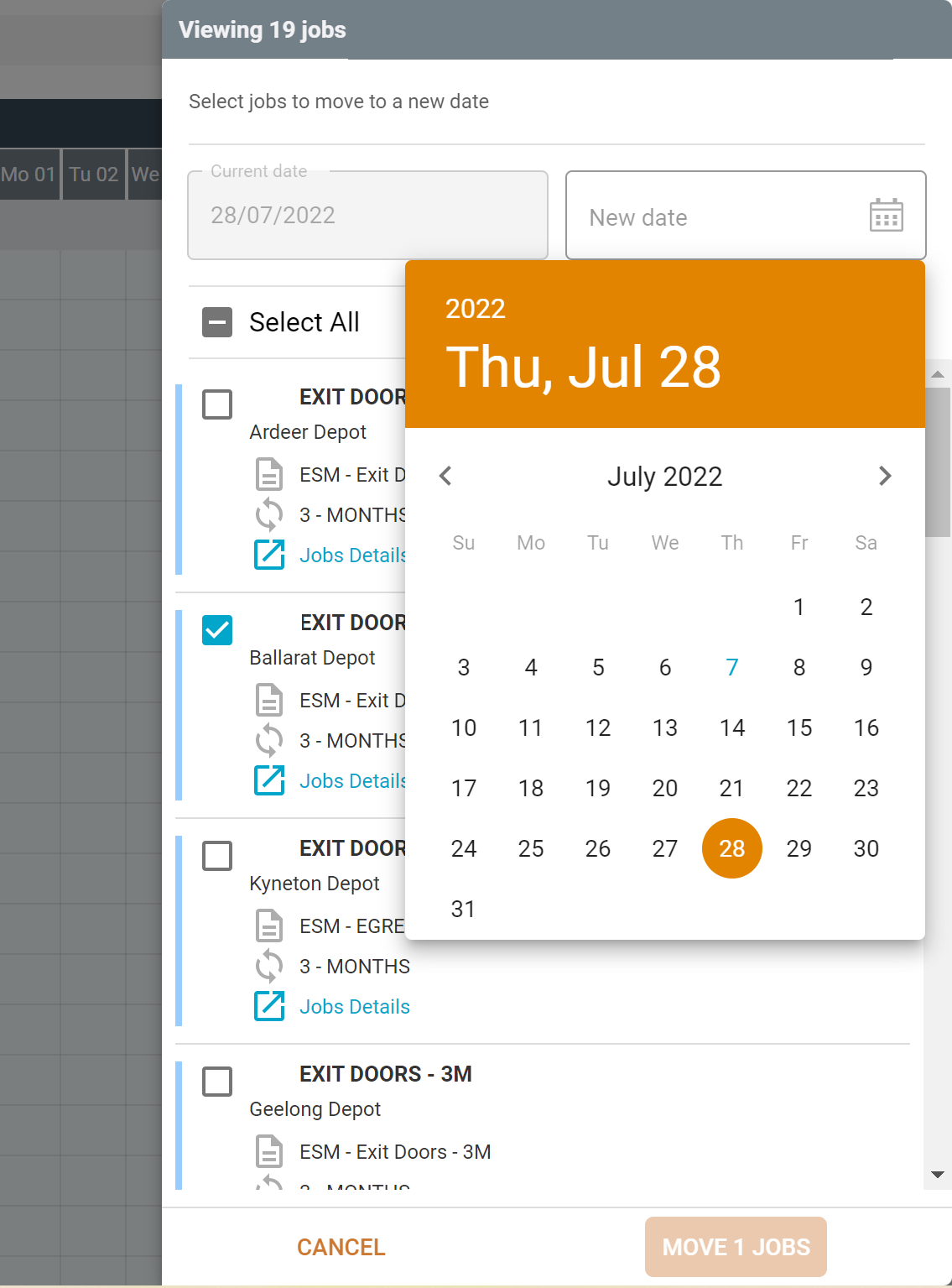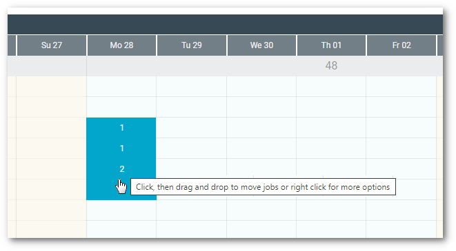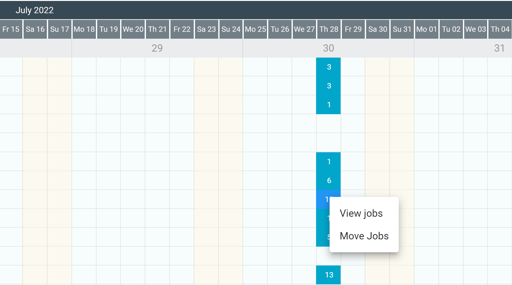 - Right-click on the numbered square to view or move the jobs for the selected day. Select the ‘move’ option to list the jobs, then select one or more jobs to move to a future date.