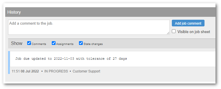 When a job’s due dates have been updated or moved in the planner, a history of the updates will display on the job details page.