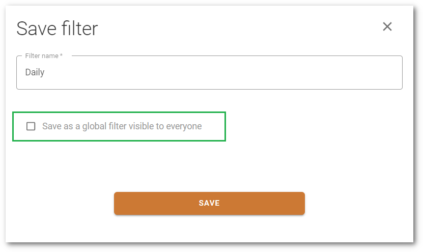 - Saved filters are saved against the logged in user and are not available to other users. See Global filters below for information on shared filters.