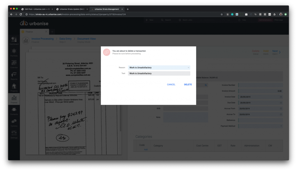 The ‘work flow’ in Invoice Processing has been changed to avoid invoices piling up in the rejected queue. To achieve this the ability to ‘delete’ invoices was added, as well as changes to the way in which ‘rejecting’ an invoice works. [PHX-4347]