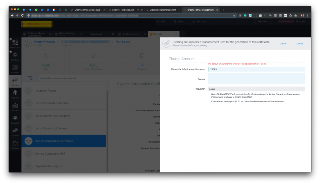 Previously, when generating an Owners Corporation Certificate (in Victoria) the system automatically charged a disbursement based on the management agreement. Now the system will give you the opportunity to override that default value, and a reason for the override.